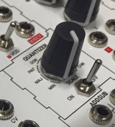 Un cuantizador de tensión permite generar versiones sometidas a corrección de escala a partir de tensiones continuas, con opciones para escalas mayor, menor, pentatónica, dórica, tonos enteros, cromática, y otras rotuladas como MA7 (posiblemente mixolidia) y MI7. La version final de Modulör114 integrará un controlador de cinta (ribbon controler, ocupando el espacio en blanco que veis en la foto general) con el que resultará particularmente útil el cuantizador, pero igualmente es interesante en otros muchos usos permitiendo producir notas apropiadas a partir de cualquier tipo de excitación o control continuo.