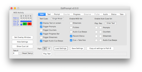 Se trata de una aplicación bastante util para identificar y organizar todo tipo de grabaciones en sincronía con la imagen, el guión o determinados textos ingresados desde el DAW. Para ello ofrece varias formas de señales sonoras y visuales como texto, barras de progreso, números, entre otros, los cuales ahora en la segunda versión pueden grabarse en archivos de listas de EdiPrompt. Ahora también puede realizarse bypass sobre disparadores visuales y sonoros de cada cue, mediante un nuevo botón BP disponible para señales de EdiCue.