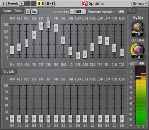 Los controles regulan cómo de abierto en el tiempo es el efecto en cada banda, y así permite generar una sensación de primer plano o por el contrario un sensación más abierta, distante y reverberante. En la lista desplegable 'Impression' contamos con 6 ajustes que corresponden a diferentes patrones de reverberación para esas diferentes escalas de distancias y aperturas. Los ajustes de tiempos muy cortos pueden derivar en sensaciones de 'flanging' que si son indeseables pueden mitigarse con los controles de 'mix' en cada banda.