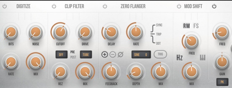 Cuenta con efectos independientes para cada capa que reúnen simultáneamente distorsión, filtrado, flanger, EQ, y modulación anillo/desplazamiento de frecuencia, además de efectos globales en envío de delay y reverb, pudiendo en esta última incluso cargarse respuestas impulsivas. Tampoco faltan otros recursos propios de producciones actuales como el uso de un LFO global a tempo sobre la amplitud con el que forzar un patrón de 'pumping' que enfatice el ritmo y groove y que en el fondo puede definirse de forma parecida a una envolvente con loop.