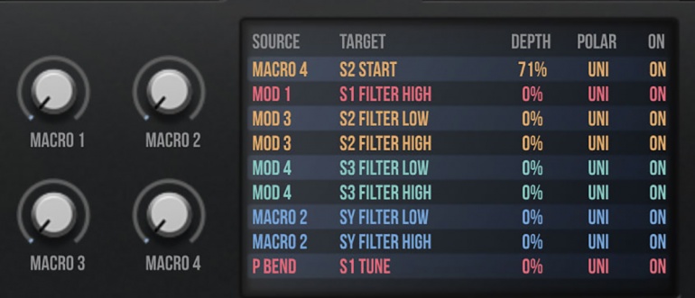 Hay 9 rutas de modulación definibles, con variedad de fuentes y destinos, y con posibilidad de aplicar 4 envolventes específicas para modulación independientes de las existentes en otros puntos del sistema. Y posibilidades de creación de controles macro, automatización total vía MIDI, etc.