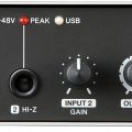 En el frontal encontramos la entrada de micro con conector Neutrik XLR y preamplificador analógico clase A “D-PRE” de Yamaha, así como una entrada de línea TS de alta impedancia. Ambas tienen control de ganancia e indicador de pico. También hay salida de auriculares, control de volumen master y un interruptor para activar la monitorización directa con latencia cero.