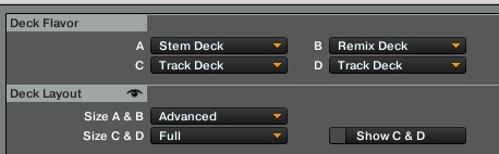 La principal novedad de Traktor 2.9 es que ahora es capaz de reproducir archivos en formato Stems y controlar la reproducción y mezcla interna de esos archivos tanto desde el hardware compatible oficial como desde cualquier hardware controlador, ya que Traktor 2.9 permite mapear todos los controles relativos al funcionamiento de Stems a cualquier controlador MIDI que tengamos a mano. Ahora además de los dos tipos de deck que ya teníamos disponible en Traktor, el “Track Deck” y el “Remix Deck”, se une una tercera variante de deck llamada “Stem Deck”. En las opciones de Deck Layout de las preferencias de Traktor podemos ver esta nueva opción: