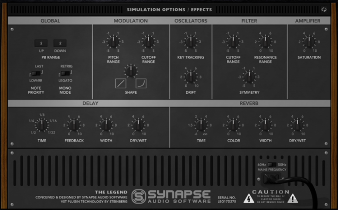 A los controles propios del panel frontal se suma un panel trasero que permite elegir entre la emulación de dos generaciones (early y late) de MiniMoog, así como realizar pequeños 'desajustes' con los que mejor imitar características propias del envejecimiento y las tolerancias de los componentes en un sistema analógico. También permite añadir efectos de delay y reverb para completar un sonido más acabado.