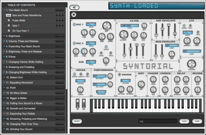 Syntorial es una aplicación creada como un sintetizador interactivo en el que los sonidos se crean a partir de retos al estilo de un videojuego, ello debido a un implícito interés pedagógico en la aplicación, creada principalmente para entrenar en los conceptos de síntesis y permitir el aprendizaje práctico del diseño de sonidos mediante un sintetizador.
