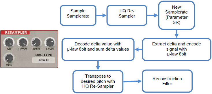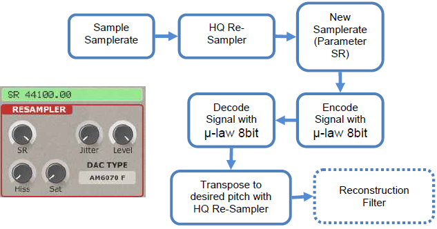 Sample Hold permite hacer primero un sobremuestreo de alta calidad (hacia una velocidad final fija de entre 8KHz y 44,1 Khz) para a continuación usar una estrategia sin interpolación (puro Sample&Hold) para obtener los valores con los que reproducir diferentes alturas / notas.