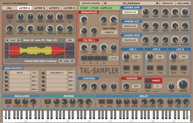 Esas son las cuestiones que TAL-Sampler aborda y que lo distinguen. No se trata tanto de un sampler para fidelidad extrema, sino para indagar en el carácter que existía en aquellas máquinas primeras. A partir de las grabaciones iniciales tal como aparecen en cada fichero audio, TAL-Sampler aplica un proceso de 'resampling' que afecta al tipo de codificación y de interpolación. Tras ello cuenta con un elemento de saturación y otro de añadido de ruido 'hiss'.