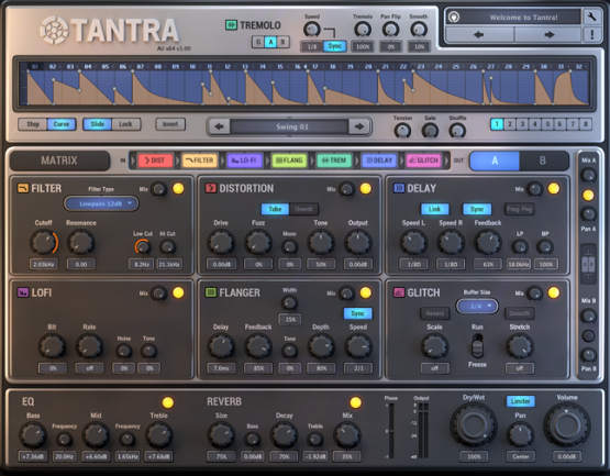 En esa liga sitúo a Tantra, un plugin de efectos que sin destacar especialmente por ninguno de ellos en particular, acierta a combinar en un único producto una pequeña colección (filtro, distorsión, lo-fi, delay, flanger y glitch -para efectos tipo 'stutter') más una EQ y reverb general a la salida. Tantra cuenta con un juego de 8 moduladores que permiten aplicar otros tantos patrones que se desarrollan en 32 pasos y en los que el nivel, posición, forma y duración de cada paso y transición son ajustables.
