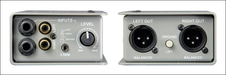 Como entradas cuenta con una pareja de RCAs, una pareja de jacks de 1/4 de pulgada y finalmente el clásico conector estéreo de 3.5mm omnipresente en salidas audio de ordenadores y tabletas. Es interesante que todas estas entradas están cableadas en paralelo, por lo que la señal conectada a uno de los juegos está disponible como salida, aumentando las posibilidades de conectividad. Las salidas, ya balanceadas y aisladas tras atravesar una pareja de transformadores, se ofrecen en una pareja XLR, con los clásicos beneficios de adaptación de impedancias y de, principalmente, eliminación de los zumbidos por bucles de masa al separar el circuito eléctrico de la fuente sonora con el de la parte receptora.