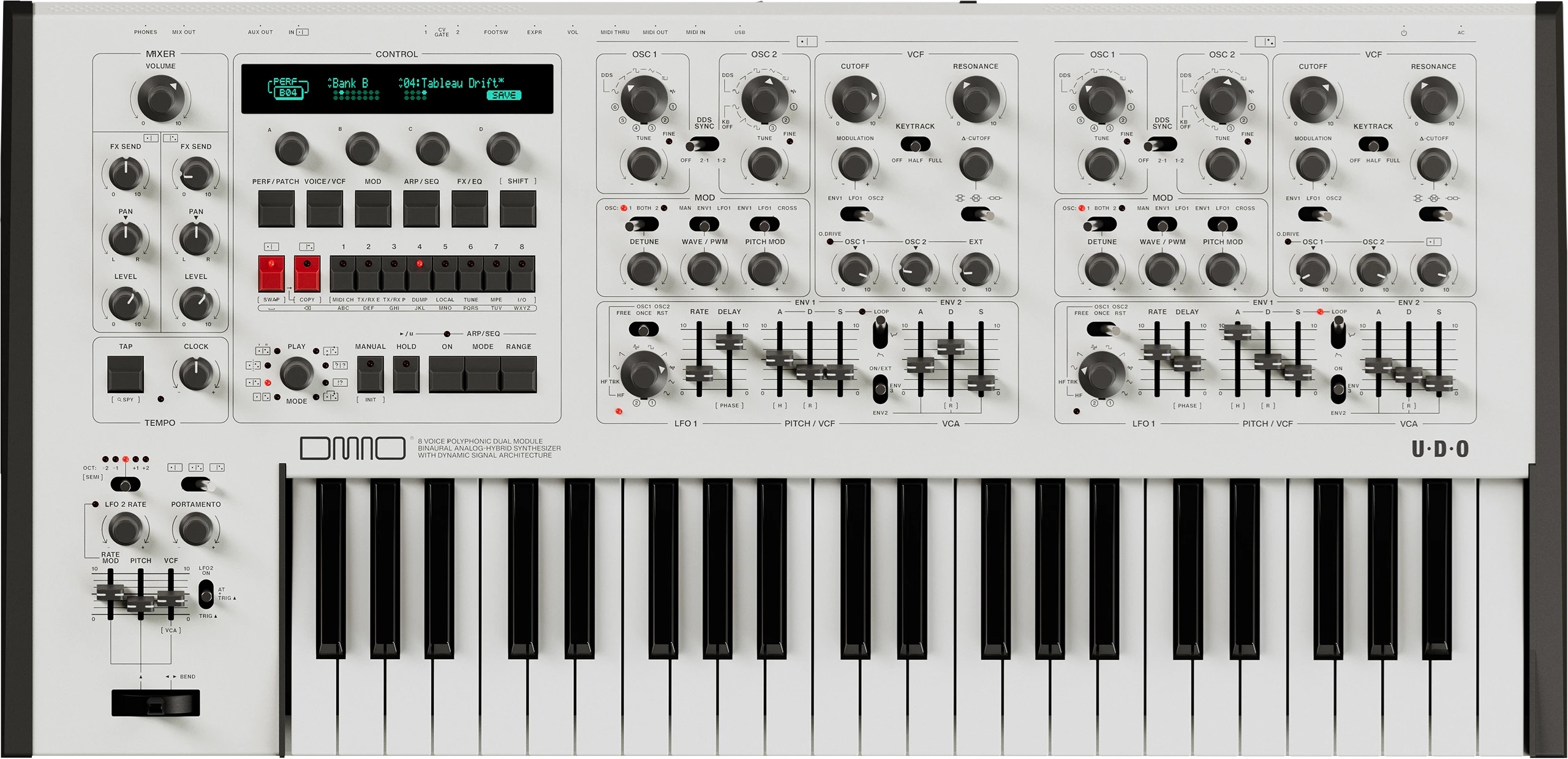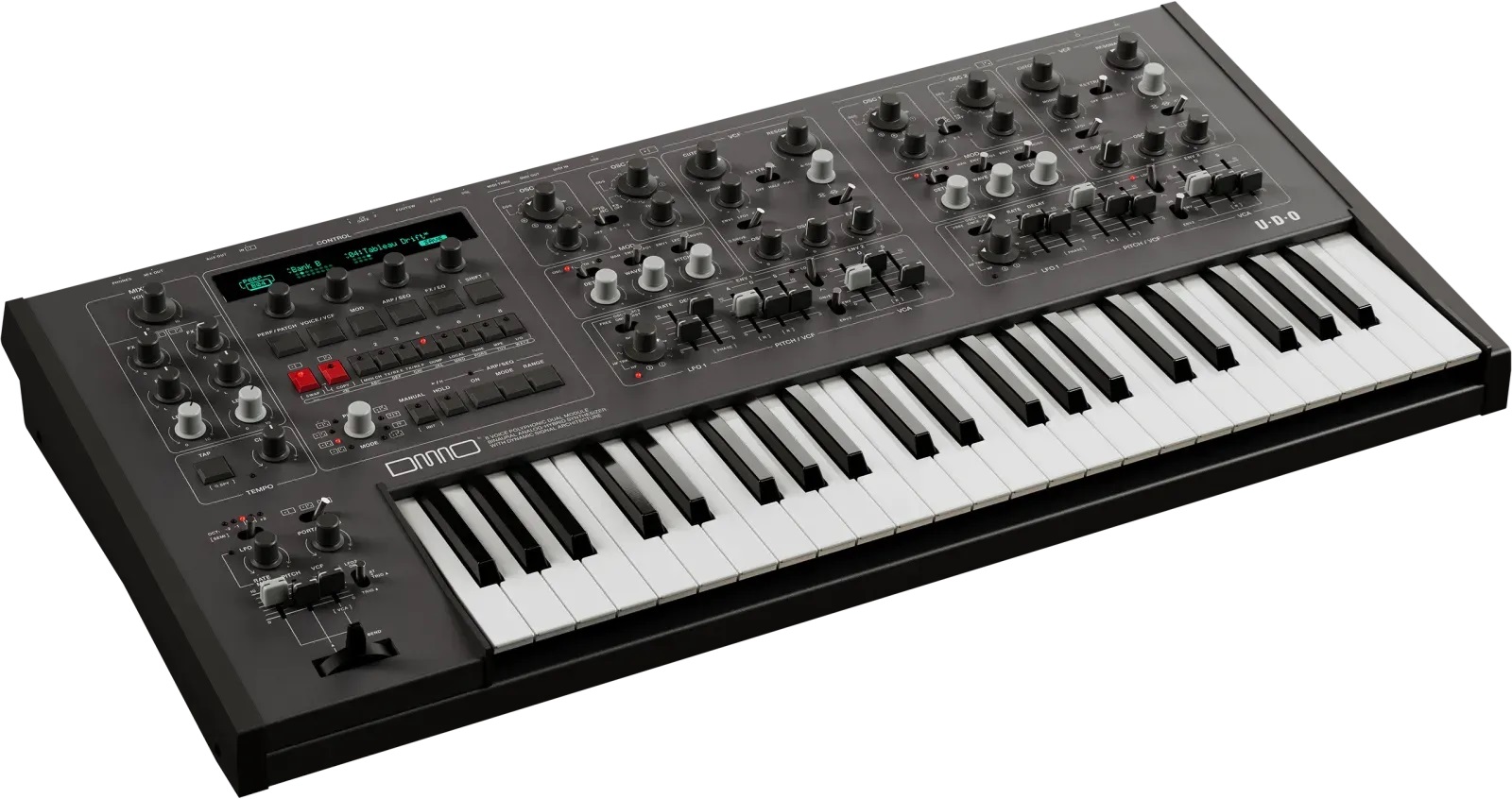 La británica UDO concentra todos sus saberes y poderes en un formato 3 octavas, y con un panel que tiene (al estilo del modelo Gemini) un juego de controles independiente por cada timbre.