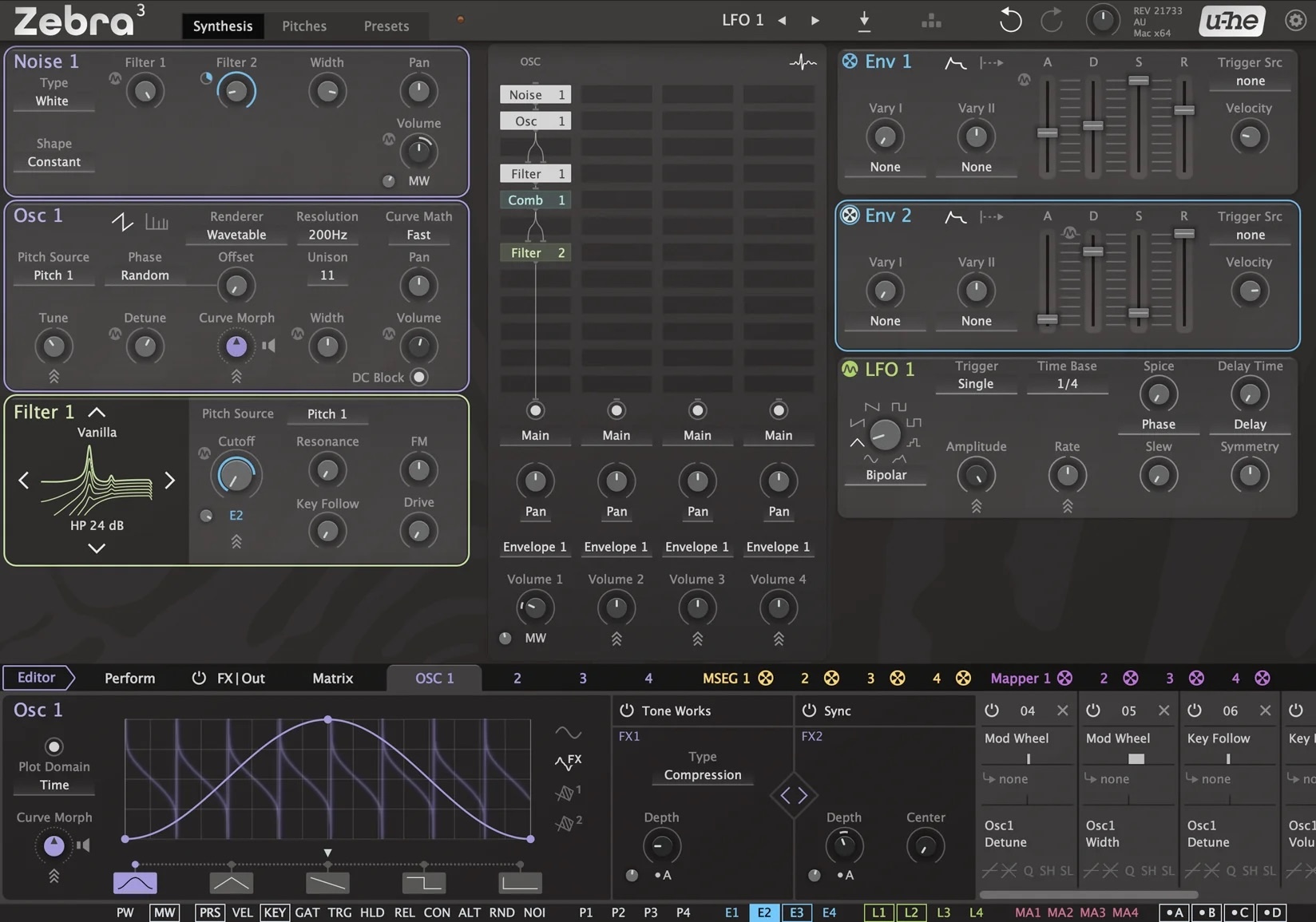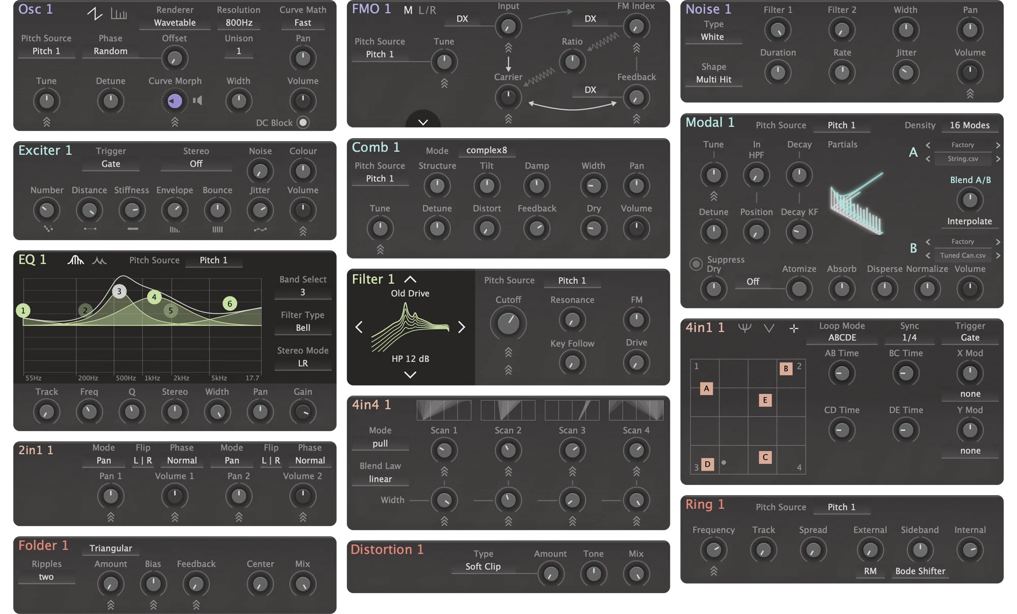 Zebra 3 no solo renueva su motor de síntesis, sino que lo expande hasta convertirlo en un entorno modular definitivo donde conviven todo tipo de tecnologías como osciladores capaces de morphing geométrico, motores wavetable con unísonos masivos y síntesis aditiva de hasta 1024 parciales. Todo ello acompañado de herramientas de modelado físico como resonadores modales, combs y excitadores diseñados para generar transitorios realistas. Al sumarlo todo, tenemos un sintetizador virtual que puede moverse con total naturalidad entre lo analógico, lo digital y lo "acústico".