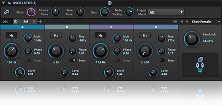 Quizá lo que más gratamente me ha sorprendido es encontrar llevadas a un producto algunas ideas sobre síntesis FM que tenía rondandome la cabeza hace largo tiempo, y que permiten algo desconocido en los clásicos 'DX': barrer la frecuencia no de forma contínua sino saltando por la serie armónica. Algo muy interesante para lograr efectos de tipo 'sweep' que siempre fueron un terreno inabordable para los FM clásicos. Un recurso bien atractivo. Esa nueva función se llama 'Snap ratio' y puede ajustarse individualmente en cada operador. Nuevos también en la FM de Falcon, aunque esto sí era conocido y bien útil en los DX, el modo 'fixed frequency' (aquí llamado 'Hz mode') y la adición de un control 'fine tune'. Además aparece como novedad control sobre la fase de arranque de cada operador. Permanece como un juego de 4 operadores, pero esto no desdice de su capacidad, toda vez que podemos instanciar varios juegos de 4 operadores independientes dentro de un mismo sonido y así alcanzar estructuras FM bien complejas.
