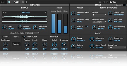 El modelado físico de 'Pluck' se retoca con nuevas funciones, destacando un modo estéreo y opciones ampliadas relativas a la excitación con muestras (dotadas ahora de controles 'keyfollow', 'detune' y 'start') o a la adición de ruido en la excitación con nuevos parámetros.