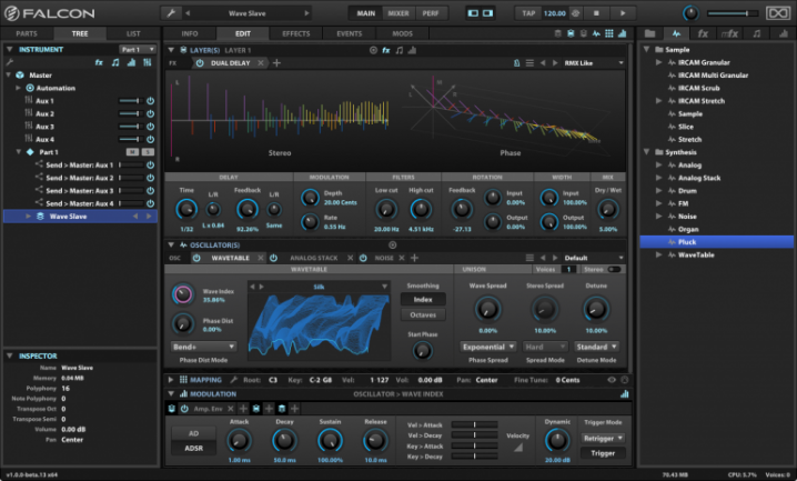 Falcon 1.1 añade también nuevos efectos complejos y soporta ahora control multidimensional con MPE, el protocolo que se usa en dispositivosLinn Instrument, ROLI, y semejantes para poder animar independientemente cada una de las notas ejecutadas.