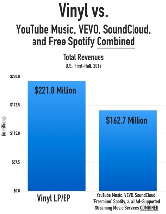 Según la RIAA (Recording Industry Of America), el vinilo genera más ingresos que YouTube, Vevo, SoundCloud y las versiones gratuitas de los principales servicios de música bajo demanda combinados. Aseguran que en la primera mitad de este año el formato ha alcanzado los 221,8 millones de dólares de beneficio como consecuencia de las 9,2 millones de unidades que se han despachado; una cifra que supera a la alcanzada en todo 2014.
