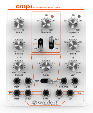 El tercero es un módulo de compresor llamado cmp1, que además de ofrecer funciones tradicionales de control de señal, permite modulación, pudiendo enlazarse de diversas formas a otros módulos. cuenta con una sección de compresión, control dedicado de threshold y niveles, además de opciones adicionales mediante CV.