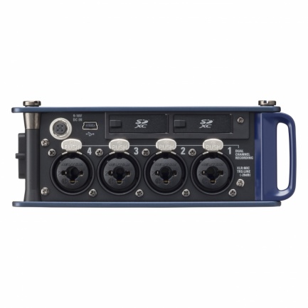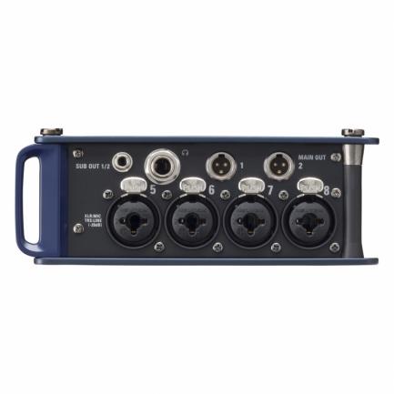 Cada canal tiene una perilla de control de ganancia, un medidor LED de 6 segmentos e interruptores PFL y Record Ready. Para las salidas se cuenta con puerto 1/4" para auriculares con control de volumen, además de cuatro salidas mini XLR balanceadas para conexión con mezcladores externos y unidades de procesamiento, y dos salidas sub para conexión a cámara.