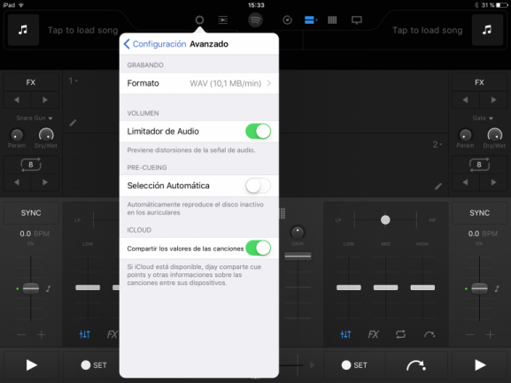 - En los dispositivos con iOS, debe estar activada adicionalmente dentro de Djay Pro la opción de “Compartir los valores de las canciones” dentro de la pestaña Avanzado de las preferencias.