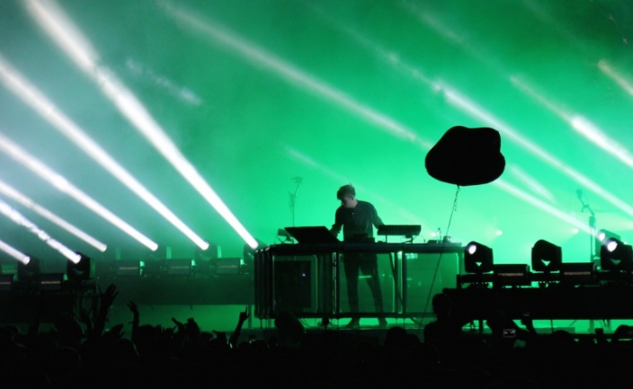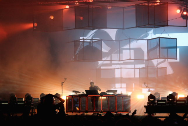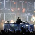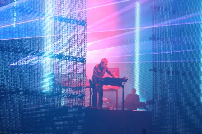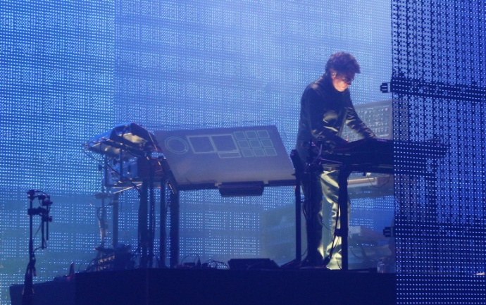 El show de Jarre tuvo una puesta en escena bastante espectacular, en el centro y en lo alto Jarre rodeado por bastante cacharrería: un Roland JD-XA, un Moog Modular, controladores de percusión, un controlador Emulator –con el que tampoco es que hiciera mucho–, guitarra y hasta un iPad con el que tuvo un momento WTF! en la recta final del directo en el que nadie entendía qué hacía con el aparato. Estaba flanqueado por dos músicos de apoyo que se encargaban de percusión, teclados y cualquier otra cosa que no le interesara tocar a Jarre, y rodeado por 3 cortinas móviles gigantes de leds dispuestas a diferentes distancias para crear sensación de profundidad y que se iban ubicando de diferentes maneras durante el show, ya fuera para dar ambientación colorista, mostrar simples geometrías de colores o imágenes de vídeo en movimiento. Y láser, mucho láser, láser a punta pala, bien de láser, láser hasta para curar la miopía. A lo largo de la hora y media de la que dispuso en el escenario principal Sónar Club consiguió amasar una cantidad de gente bastante considerable a la que deleitó con sobre todo temas de sus dos últimos trabajos, y a pesar de no contar con voces de Peaches o Pet Shop Boys no se cortó un pelo en soltarlas grabadas. Cuando interpretó "Exit" se encerró tras los LEDs para ponernos a Snowden en tamaño gigante y enviarnos ése mensaje de preocupación en el que relaciona la pérdida de privacidad en la red con la pérdida de libertad de expresión. Hubo momentos de sonido de club que pusieron a la gente a bailar como loca, pero la ampulosidad y fanfarria de Jarre tendía a romper inadecuadamente esos momentos climáticos para soltar su trabajada parafernalia melódica. Jarre acepta los sonidos modernos, pero quizá no termina de entender los contextos en los que los más jóvenes los disfrutan, que son los que a fin de cuentas van a estos festivales. Se reivindicó con alguno de sus clásicos, y sacó el arpa láser para tocar The Time Machine y se despidió a continuación con Stardust, no sin antes decirle al público que llevaba mucho esperando una noche como esta.