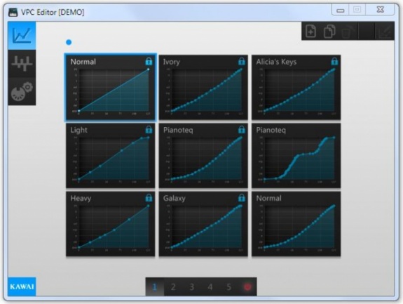 [Índice]Un controlador va a ser usado con diferentes fuentes a lo largo de su vida. Por eso, y a pesar de que los módulos de sonidos, plugins, etc. que vayas a disparar cuenten con opciones para modificar la respuesta a la velocidad, puede ser muy útil que el propio teclado aporte alguna variedad en ese sentido. Desde elegir entre un pequeño grupo de respuestas (desde las 'soft' a las 'hard') hasta permitir un diseño personalizado al extremo como en esta figura tomada de la información sobre el VPC-1 de Kawai: