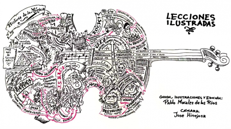 Para ello se hace sumamente útil el ejercicio pedagógico de ilustrar y manifestar en los textos tales relatos, cosa que se ve reforzada por la capacidad de producir hoy en día material audiovisual que pueda ser compartido públicamente, como el siguiente vídeo, creado hace un par de años por el artista español Pablo Morales de los Rios quien en siete minutos condensa una gran cantidad de información con la cual busca narrar una historia de la música occidental desde la antigüedad hasta el siglo XX, básicamente reflejando algunos movimientos y manifestaciones musicales que van rápidamente a través de la época antigua, el renacimiento, la modernidad, el romanticismo y finalmente hasta llegar a la revolución del siglo pasado. Veamos: