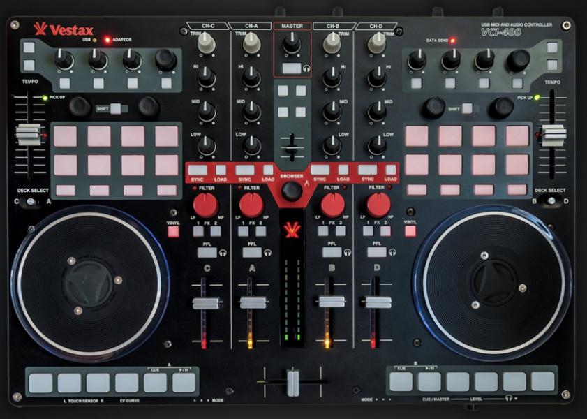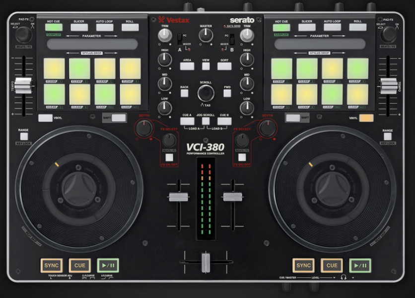 [Índice]En 2012 Vestax llevó al mercado sus dos último y la vez mejores controladores. Por un lado estaba el VCI-380, diseñado especialmente para Serato y retomando el espíritu del VCI-300. Este nuevo controlador incorporaba el nuevo ajuste de tensión de los jogs, pero al mismo tiempo introdujeron en ellos un indicador luminoso giratorio. Incorporaron también tiras táctiles para hacer needlesearch, 8 pads por deck sensibles a la velocidad y con aftertouch, salidas balanceadas y entrada de micro en formato XLR, y lo mejor de todo: la posibilidad de usar el controlador como mezclador autónomo e incluso aprovechar su interfaz para control por DVS. Quizá su único defecto fue que no ofrecía controles para los efectos, aunque eso más que un defecto es porque Vestax pretendía seguir vendiendo el VFX-1 que ya había lanzado en el pasado para la VCI-300.