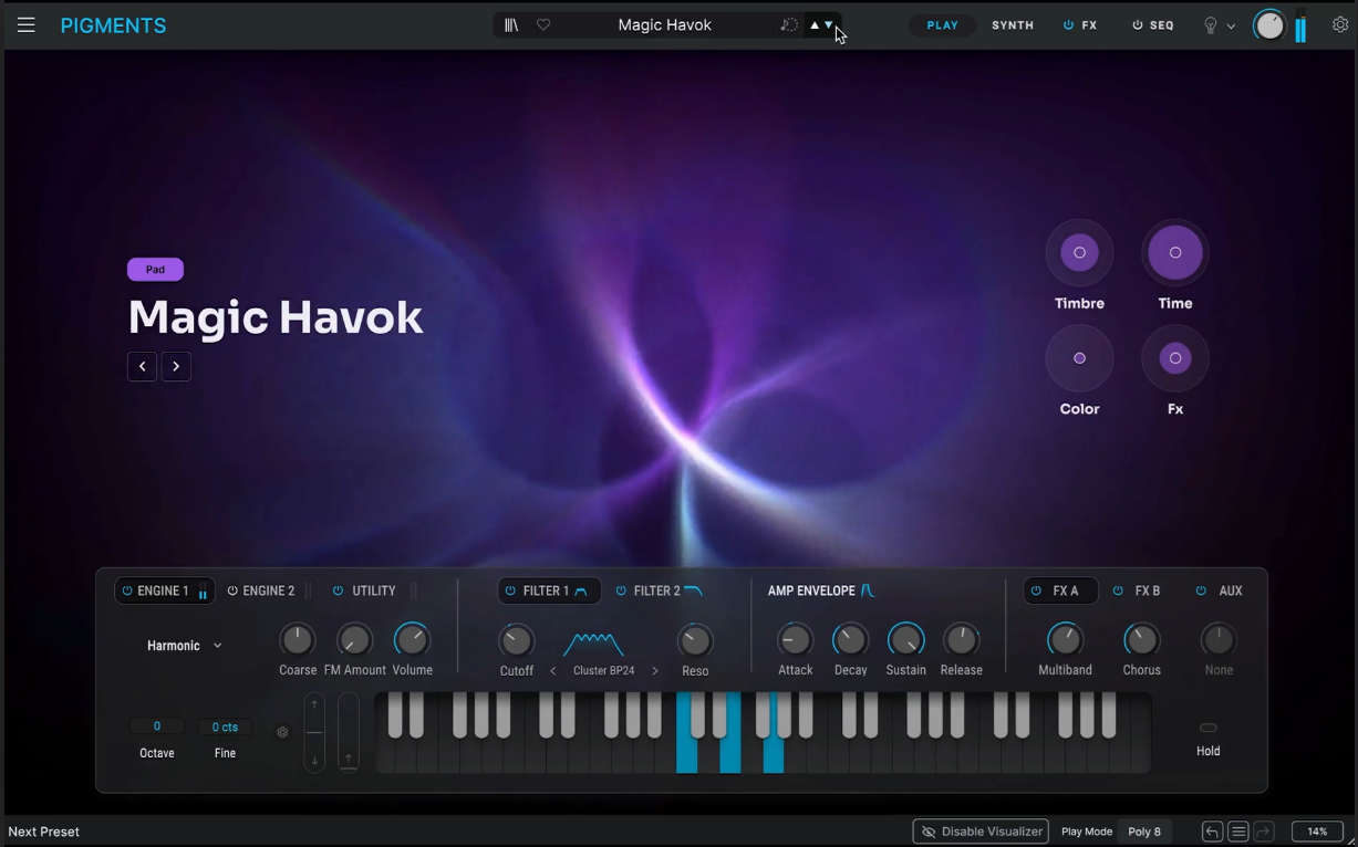 En la actualidad, para poder usar técnicas variadas de síntesis y, lo que es aún mejor, combinarlas desde una sola herramienta en un mismo sonido, Pigments es mi primera opción. Es difícil pedirle algo y que no lo pueda ofrecer. Hay VA, filtros variados, FM, wavetables, reproducción de muestras, tratamiento granular, resonadores, modelado físico, vocoder, ... Y en todos y cada uno abundancia de parámetros como para no echar de menos herramientas específicas de cualquiera de esas técnicas. Llevar el enorme universo sonoro que la síntesis ofrece hoy a un instrumento comprensible sin tener que sufrir dolores de cabeza es el poder de Pigments.