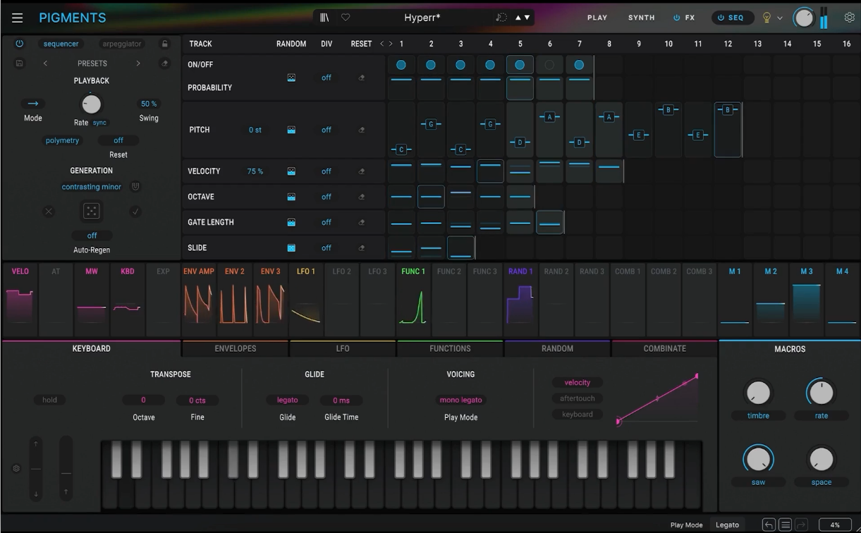 Contribuyen a las buenas sensaciones de Pigments, más allá de sus enormes posibilidades para la síntesis, estar muy bien dotado en cuanto a efectos, una más que decente librería (más de 1700 sonidos, aparte de los disponibles en librerías adicionales), numerosos ejemplos tutoriales guiados e interactivos que se desarrollan en el propio plugin y que muestran y enseñan cómo llegar a crear varios sonidos 'típicos' de ciertos estilos, o las herramientas creativas integradas a través de diversos moduladores atípicos que van más allá del clásico juego de envolventes y LFOs y permiten introducir elementos generativos, fuentes de ruido y aleatorización bajo diferentes patrones y esquemas, o elementos vinculados a la interpretación (desde MPE, a restricciones de escala, y tantos otros).