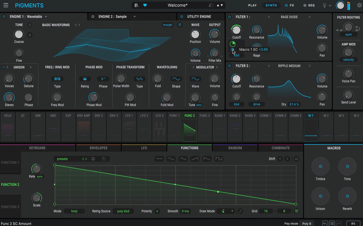 [Índice]En un mercado lleno de productos, Pigments destaca y se hace querer por un balance exquisito que le permite ofrecer amplias posibilidades de edición y parametrización en cada una de las múltiples técnicas que aglutina, sin llegar al uso verdaderamente complejo que otros entornos exigen (estoy pensando en otro de mis favoritos, el también francés UVI Falcon). Hay otras herramientas que pueden ofrecer también diversidad de técnicas y generosas librerías desde un interfaz accesible, pero a menudo palidecen en cuanto a la profundidad de parámetros y las posibilidades de personalización (en este caso estoy pensando en Omnisphere, el 'otro' de mi trilogía de sintes soft polivalentes preferidos actualmente).