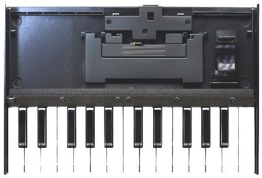 [Índice]Roland ofrece como opción un teclado específico para estos sintes Boutique: el K-25m (100€). Son 25 teclas mini, esta vez con velocidad y con un recorrido vertical amplio y por tanto nada que ver con el criticado teclado del System-1, aunque no deja de ser un teclado reducido del que no soy personalmente amigo. Aunque mejoran respecto a System-1, la sensación y control de la velocidad la noto inferior a la que se tiene en los Reface de Yamaha, y sobre todo, por 100€ quien lo necesite puede adquirir un teclado controlador convencional. El bendito formato módulo que otros fabricantes desestiman nos permite en este caso decidir al respecto, así que no creo que nadie pueda objetar.