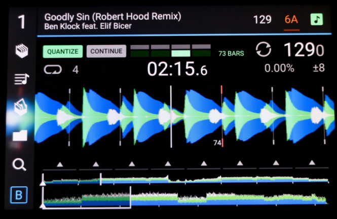 Otro detalle de relativa importancia es que a pesar de que el SC5000 dispone de una pantalla de bastante más resolución que las que monta Pioneer, la representación gráfica de la onda es algo menos detallada. Sin embargo, a cambio de menor detalle, ofrece una representación basada en tres capas de color superpuestas para representar el tipo de frecuencias más predominantes en cada momento de la canción: azul para graves, verde para medios y blanco para agudos. Cuando te acostumbras a “leerla” es de bastante utilidad.