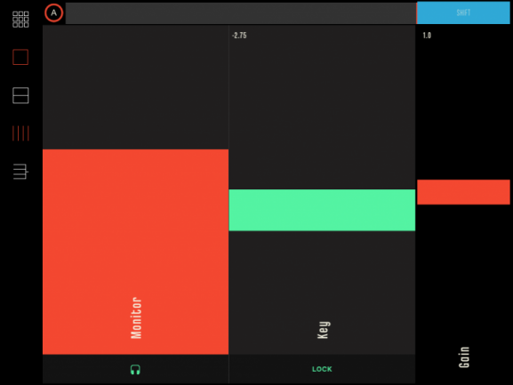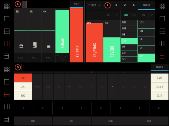 En un lateral de cada área de control, tenemos unos iconos con los que pasar de un modo de control a otro –los dos iconos inferiores–, así como cambiar el deck que maneja ése área de control –el icono superior–, o hacerla más grande –los dos botones siguientes–, lo que conlleva controles de mayor tamaño pero menos áreas de control; podemos mantener las 4 áreas por defecto, pasar a 2 o una única área de control. Además del ya mencionado modo “Player” destinado a todos los comandos de transporte, tenemos el modo “Mixer” en donde manejamos los niveles y la EQ individual de cada deck y el modo “FX”, desde donde podemos controlar los parámetros de hasta cuatro bancos de efectos y su asignación a los decks.