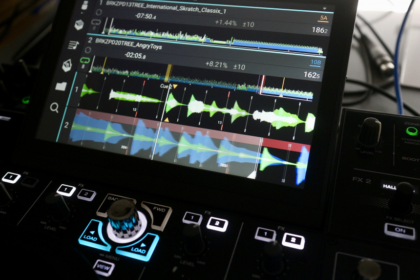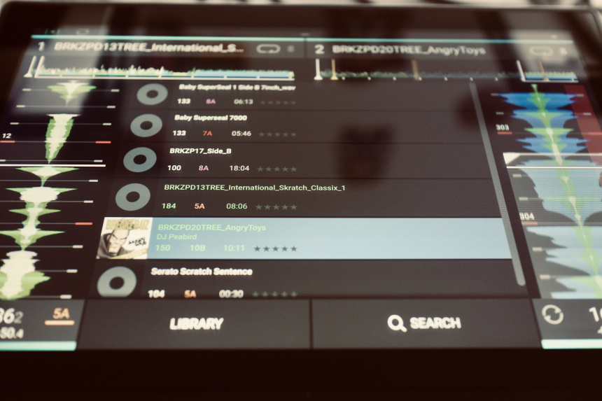 Respecto a los gestos que se han introducido en la interfaz táctil, debo decir que son útiles, pero hay que acostumbrarse a ellos. El mismo gesto de deslizar a un lado u otro una canción al navegar por el modo librería o por el modo de reproducción, tiene una función distinta. Si en el modo librería hacemos el gesto de deslizar el dedo a la derecha mientra tocamos un tema, lo enviamos a cargar y después debemos elegir en qué deck, mientras que si lo hacemos a la izquierda lo enviamos a la lista de preparación. En el modo de reproducción, donde tenemos acceso a la playlist actual en el centro de la pantalla, hacer el gesto de deslizar a la derecha carga el tema en los decks 3 o 4 -el que tengamos activo en los controles físicos- mientras que el deslizamiento a la izquierda lo manda a los decks 1 o 2. No es especialmente complicado pero más de uno se va a liar con los gestos hasta acostumbrarse, aunque de todos modos para evitar liarse con los gestos siempre se puede recurrir a los controles físicos. Finalmente seguimos contando con el curioso gesto de pinchar o estirar con los dedos la forma de onda directamente en la pantalla para acercar o alejar el zoom de visualización, algo que personalmente me encanta.