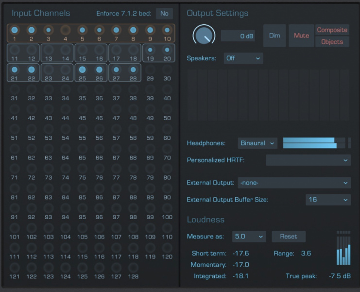 A continuación tenemos control visual de las pistas, y en el caso de disponer de una curva HRTF personalizada para la escucha en binaural, la podrías importar y emplearla. Por último, tarjeta de audio y buffer size, así como todo los controles de medición, que he de decir que no concuerdan exactamente con la medición que obtienes en Dolby Atmos Renderer. En mi caso en concreto he encontrado pequeñas variaciones de 0.2 db en función del proyecto y que cuando estás apurando al máximo para ajustarte al formato, podría dar algún problema.