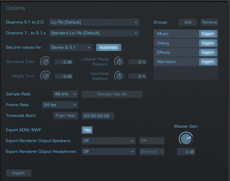 Por último encontramos Options, que nos va a permitir seleccionar los Downmix, establecer los valores de ajuste, así como crear, borrar y exportar los grupos comentados anteriormente, ajustes típicos de sample rate, frame rate y las opciones de exportación, incluyendo un Master Gain para ajustar el nivel de salida al formato requerido. También está la opción Import para importar un máster en formato ADM/BWF ya realizado y poder monitorizarlo.