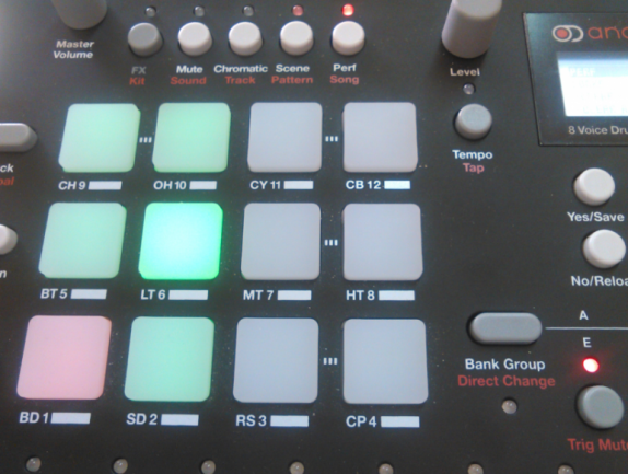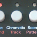 En modo ‘chromatic’ disponemos de una octava cromática en los 12 pads para poder tocar notas y con posibilidad de transportar con botones de desplazamiento por terceras mayores hasta completar un recorrido total de 4 octavas (se indican con diferentes colores en los pads) aunque es más cómodo tocar frases o líneas de bajo conectando un teclado. Lógicamente puede usarse el modo ‘chromatic’ al grabar patrones y la información de notas queda registrada. Por cierto el que el sonido se modifique o no de forma cromática puede ajustarse separadamente para la parte de síntesis y la de muestra en cada una de las pistas, muy útil cuando una crea elementos de tipo ‘transitorio o ruido’ y la otra elementos ‘de cuerpo o nota’. Es incluso posible dejar ambas en ‘off’, con lo que el modo ‘chromatic’ mantendría en realidad una misma nota en toda la excursión, lo cual resulta útil si lo que deseamos es facilitar la ejecución a mano de redobles en directo.