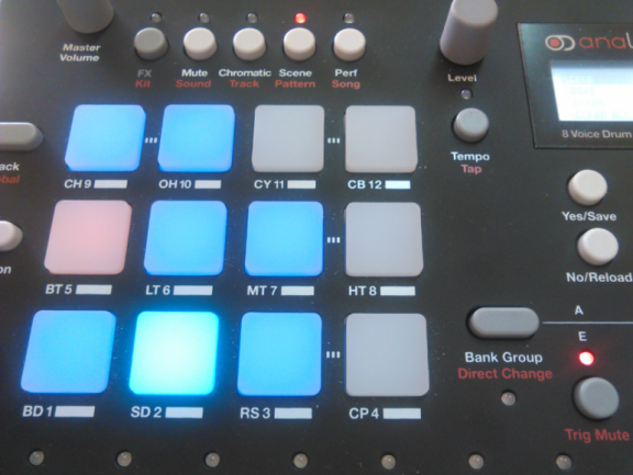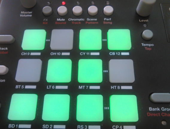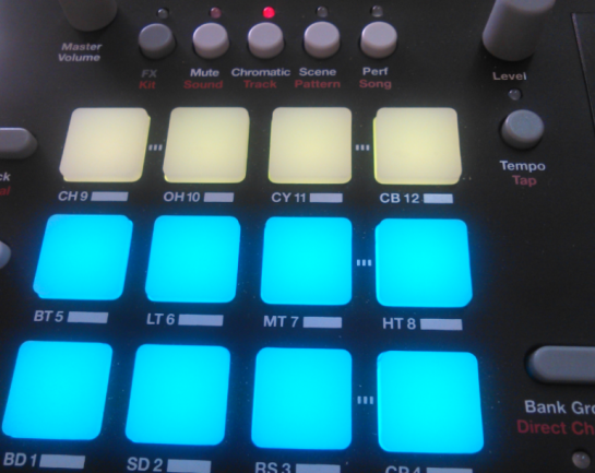 El modo ‘scene’ va mucho más allá de los meros ‘mutes’, podemos dejar preparado en cada pad un conjunto amplio de modificaciones de los parámetros de los 12 sonidos y de los efectos y mezcla, de forma que al pulsar cada botón el kit por defecto se modifica mientras esté en uso esa escena. Viene a ser como tener 12 variaciones del Kit básico que usa el patrón. Los pads que tienen cargada alguna escena muestran un azul suave. Pulsando uno de ellos seleccionamos su escena (pasa a azul brillante) o se deselecciona. Teniendo en cuenta que los cambios pueden ser radicales, me ha resultado una forma muy interesante de crear variaciones de un patrón que no afectan a su contenido en notas, pero sí y mucho a su resultado. Jugando con los niveles podéis crear variantes de mezcla como escenas, pero jugando también con las afinaciones, filtros, envolventes, efectos, número de muestra, etc. podéis alterar ya sea suave o radicalmente el juego de timbres y mezcla sin necesidad de abandonar el mismo patrón. Realmente un recurso muy potente y fácil de usar para crear variación a lo largo de un tema o sesión, con momentos de mayor y menor tensión/actividad, etc.