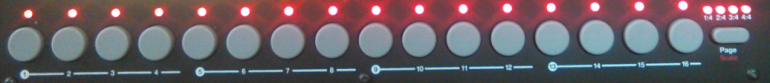 [Índice]Rytm usa un secuenciador orientado a patrones basados en pasos (hasta 64 pasos organizados y presentados en 4 paginas sucesivas de 16 pasos cada una). Como es habitual, tras seleccionar una pista podemos usar la hilera de 16 botones (más el de ‘página’) para disparar o no el sonido correspondiente.