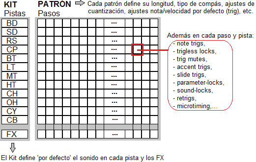 Por supuesto cada patrón define su propia longitud y tipo de compás (se puede usar incluso un modo avanzado en el que cada pista siga una longitud diferente). Cada patrón vincula con el nº del Kit que usa (puede modificarse si lo deseamos). El patrón cuenta también con ajustes de cuantización (que se aplica sobre la marcha), ajustes de swing (de nuevo no destructivo), y además define para cada pista (dentro del patrón, no del Kit) cuál es la nota/duración/velocidad/nivel de acento/etc. por defecto que ha de usarse cuando introducimos notas en modo ‘paso a paso’. Esa información es relativa al ‘uso’ de los sonidos (no a su ‘estructura’ o ‘timbre’) y por tanto está mejor guardada en el patrón (para permitir ‘usos’ diferenciados del Kit en cada patrón).