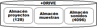 [Índice]En el ‘+Drive’(una memoria flash interna de gran capacidad) podemos conservar hasta 128 proyectos. Es también el lugar donde se conservan las muestras transferidas a Rytm (almacenadas en el ‘sample bank’). Así mismo, +Drive puede contener un catálogo de hasta 4096 definiciones de sonidos (‘sound library’). En definitiva, +Drive es un contenedor de proyectos, muestras y sonidos.