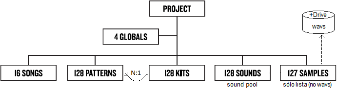 Siempre actuamos en Rytm desde un proyecto. Es a su través como llegamos a registrar patrones, y llegamos a construir y usar sonidos. Con el proyecto se guarda la lista de las hasta 127 muestras que se usan, el ‘sound pool’ o sonidos del proyecto para uso con ‘s-locks’, los 128 patrones y 128 Kits, más las cadenas y canciones.