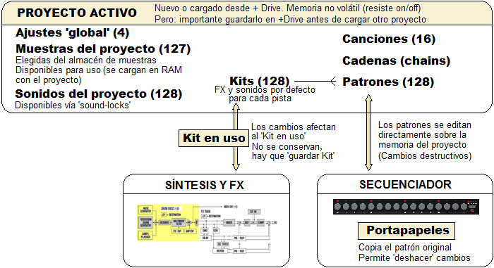 Es muy importante saber qué cosas se salvan automáticamente en Rytm, y cuáles tenemos que preocuparnos por guardar activamente. Hay que ser conscientes de algunas cosas no evidentes y que justifican muchos de los supuestos errores que algunos usuarios recién llegados encuentran en Rytm (y sus consiguientes enfados). Os he preparado este gráfico para terminar de comentarlo y entenderlo. Es más completo que el croquis que os ofrecí antes y paso a comentároslo.