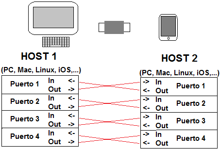 Internamente MIDI USB-USB conecta cruzados los puertos de idéntico número, con lo cual toda la información que un extremo envíe por el puerto 1 será recibida por el puerto 1 del otro host y viceversa. Lo mismo con los puertos 2, 3 y 4; sin realizar configuración ninguna, de forma transparente y simple. Es en cada host donde decidiremos qué enviamos por cada salida y qué hacemos con cada entrada.
