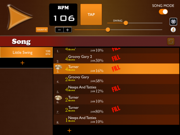 La colección de patrones principales pueden hacerse crecer con patrones del propio usuario (se guardan y bautizan creando así contenido añadido personalizado en un banco ‘user’), pero los fills no. La cuestión de los redobles queda en la ‘creatividad interna’ de la aplicación, como forma de mantenerla simple y ágil cara al usuario. En casos en que se desee más variedad y precisión puede acudirse al modo ‘song’ que nos permite encadenar patrones y fills con mayor libertad. Dentro de ese modo, podríamos ir alternando patrones propios creados con intención de servir de patrones base con otros también propios creados con intención de servir de relleno (aunque aparezcan en la aplicación como supuestos patrones principales), simulando así la presencia de fills de nuestra propia cosecha.