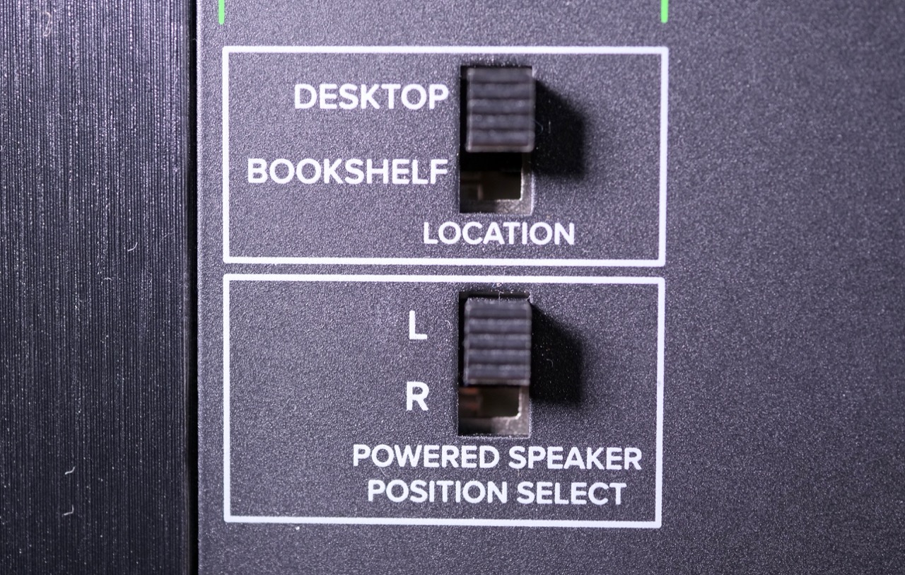 Los interruptores traseros permiten intercambiar los canales izquierdo/derecho (útil para colocar el monitor activo donde prefieras), y seleccionar el modo Desktop o Bookshelf según la distancia de los altavoces a la pared (bookshelf si van muy cerca de la pared, Desktop si están algo más alejados). Ten en cuenta que tienen puerto trasero, así que una excesiva cercanía a la pared afectará significativamente a los graves — de ahí la existencia de este interruptor.