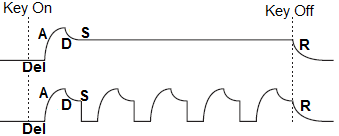 [Índice]En Prophet 12 hay 4 generadores de envolvente por voz, mientras en Pro 2 hay 5. En ambos una de las envolventes gobierna la frecuencia de corte del LPF, otra la amplitud (a través de un VCA), y dos están libres para usarse en las rutas de modulación. La envolvente extra en Pro 2 está dedicada a controlar el corte del segundo filtro (podría realizarse algo parecido en Prophet 12 con una de las envolventes libres). Todas ellas comparten un mismo diseño DADSR+Loop, y control de la respuesta a la velocidad.
