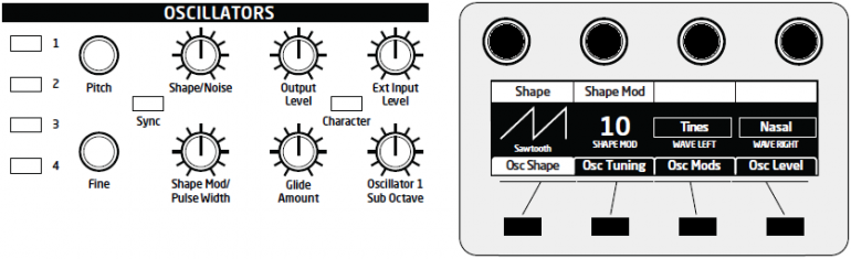 Los parámetros que podemos atacar directamente con controles dedicados en los osciladores los vimos en una figura anterior. Son la afinación (gruesa y fina), la selección de la forma de onda, el nivel de salida, el nivel de entrada de audio externa (en Pro 2), el control de anchura de pulso que dobla como control de ‘shape’ para las otras formas o de puntero dentro de las ‘wavetables’, un control de glide/portamento, y finalmente el nivel del suboscilador (siempre generado desde el oscilador 1, los otros 3 no cuentan con él).