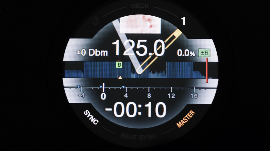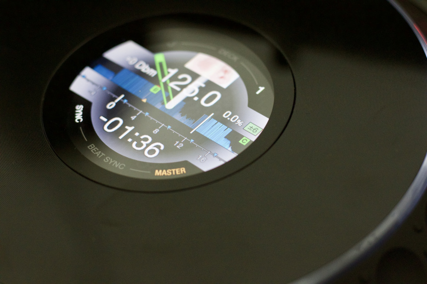 Adicionalmente, alrededor de esta pantalla podemos ver el número del deck que controla ese jogwheel en la parte superior, mientras que en la parte inferior podemos ver si tenemos el sync activado en ese deck y si el deck ejerce de master. Hay que destacar que estos indicadores no forman parte de la pantalla, si no que son indicadores luminosos. El jog tiene iluminación led blanca en los bordes que parpadea cuando la pista se acerca al final, igual que sucede en los jogs de los reproductores de gama alta, con la salvedad de que estos no cambia la luz a color rojo.
