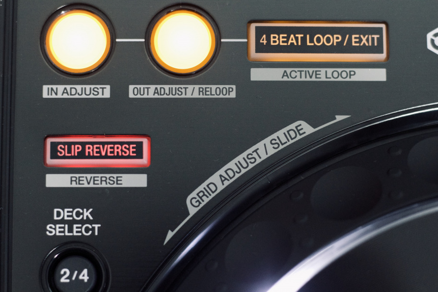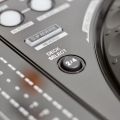 [Índice]Siguiendo con el resto de los controles del deck, tenemos en la parte superior dos botones para marcar manualmente el inicio y final de los loops, y a diferencia de los reproductores en los que necesitas dejar pulsado el botón de IN para crear un bucle automático de 4 tiempos, tenemos al lado de estos botones un botón rectangular bien visible para esta función. A la derecha tenemos botones para activar el modo slip y la cuantización, y justo al lado el encoder de navegación y carga con dos botones debajo con dobles funciones para las diversas opciones que nos permiten movernos por toda la librería. A la izquierda del jog tenemos el botón shift y debajo el botón para guardar los memory cue/loops, con doble función de borrado. Tenemos también dos botones para avanzar y retroceder por la canción, y a la derecha del jog el botón de Sync con doble función para master. Aparte de los botones de Play y Cue –mismo tamaño e iluminación que los de los reproductores– tenemos obviamente el bloque de pads multifunción cuyo funcionamiento es el esperado, responden adecuadamente sin excesiva presión, la iluminación que tienen es bien visible en cualquier situación y su tamaño es suficiente. El pitch de la derecha tiene el mismo tacto y precisión que los que encontramos en los reproductores de la marca.