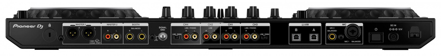 El interfaz de audio del dispositivo puede usarse para control por DVS, para ello debes en la parte trasera del aparato cambiar la posición de los interruptores que hay a cada lado de las entradas 3 y 4 –las que están en los extremos opuestos de la sección de mezcla– para que se pongan en marcha los previos phono del interfaz y así puedas conectar tus platos. Ojo porque para usar DVS sí debes pagar la expansión que habilita esta función en Rekordbox, no viene incluida con el producto.